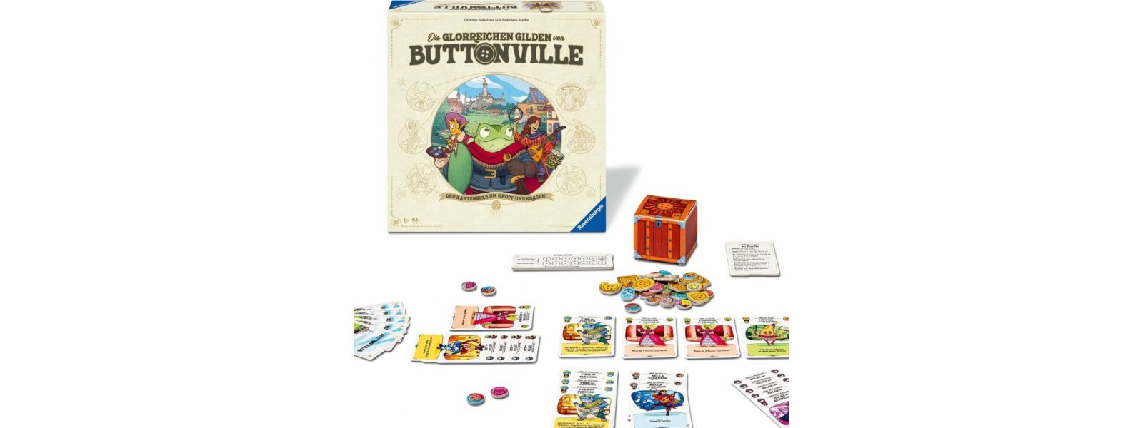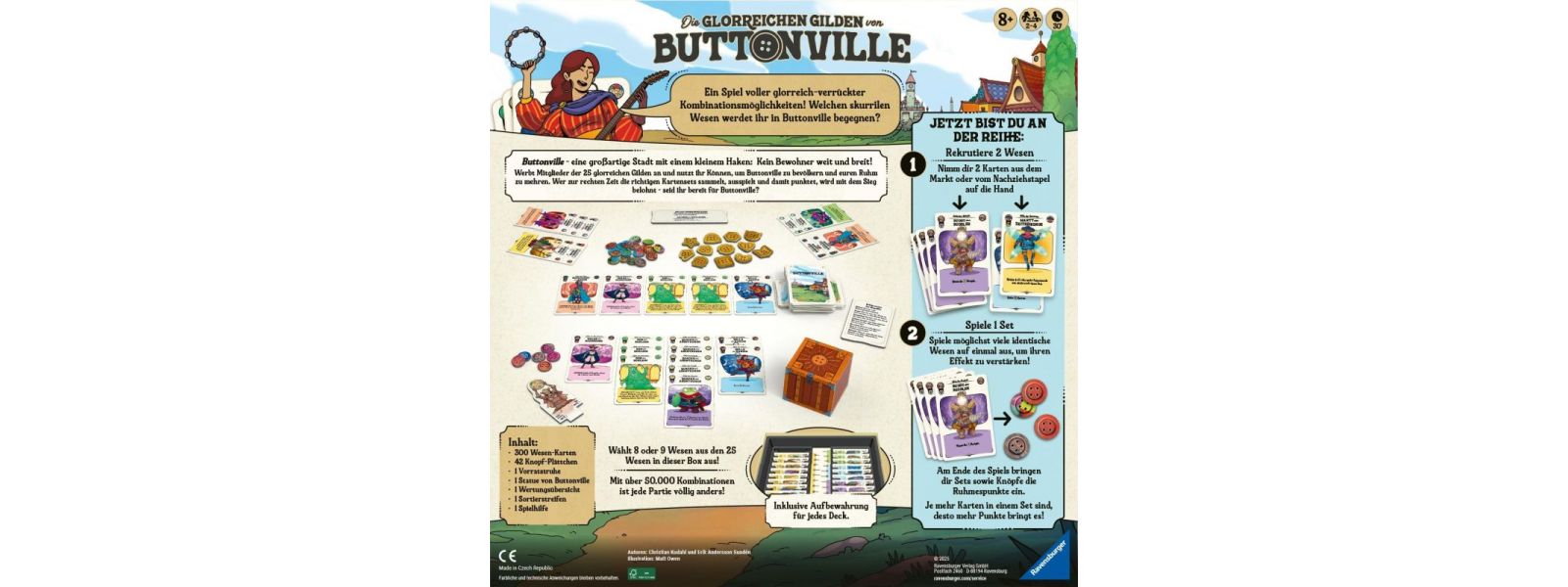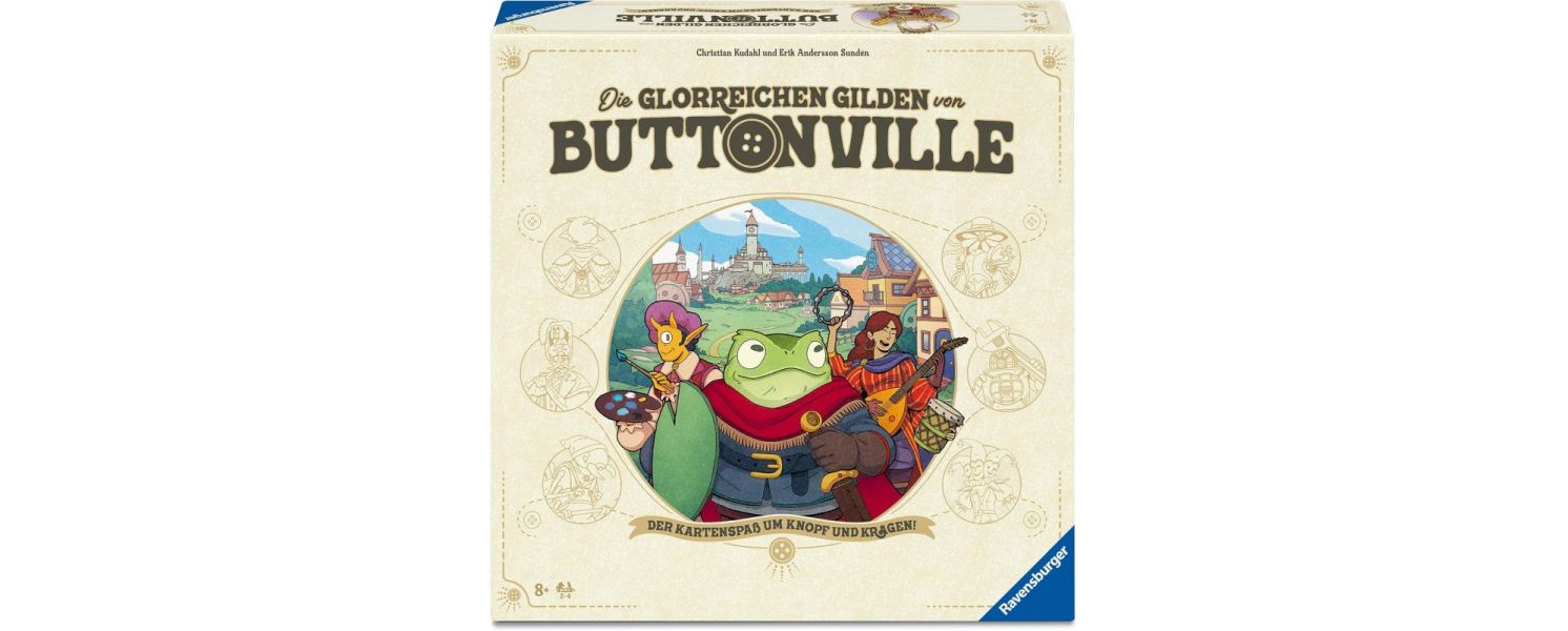 Noch lebt hier niemand! Deine Aufgabe ist es, Dorfbewohner zu rekrutieren, mächtige Gilden aufzubauen und eine lebendige Nachbarschaft entstehen zu lassen. Bist du bereit für diese Herausforderung? Die glorreichen Gilden von Buttonville ist ein spannendes Karten- und Familienspiel für 2-4 Spieler ab 8 Jahren. Mit einfachen Regeln und eleganten Spielmechaniken eignet es sich hervorragend für Einsteiger, bietet aber auch erfahrenen Spielern jede Menge strategische Tiefe. Dank der vielen unterschiedlichen Aufbauvarianten bleibt jede Partie einzigartig und sorgt für nahezu unbegrenzte Wiederspielbarkeit. Entdecke die Vielfalt der Dorfbewohner, nutze ihre besonderen Fähigkeiten und spiele deine Karten geschickt aus, um dir Ruhm und Siegpunkte zu sichern. Wer am Ende die erfolgreichste Nachbarschaft aufgebaut hat, gewinnt das Spiel - und schreibt die Geschichte von Buttonville neu!