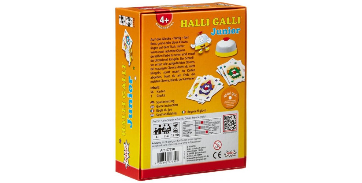 Doch aufgepasst! Wenn der eine Clown lustig und der andere traurig schaut, sollte man unbedingt die Hände von der Glocke lassen. Sonst ist man seine Karten wieder los. Bei dem neuen lustigen Kinderkartenspiel Halli Galli Junior kommt es auf Reaktionsvermögen und Konzentration an. Wer am Ende die meisten Clowns erklingelt hat, ist Sieger.