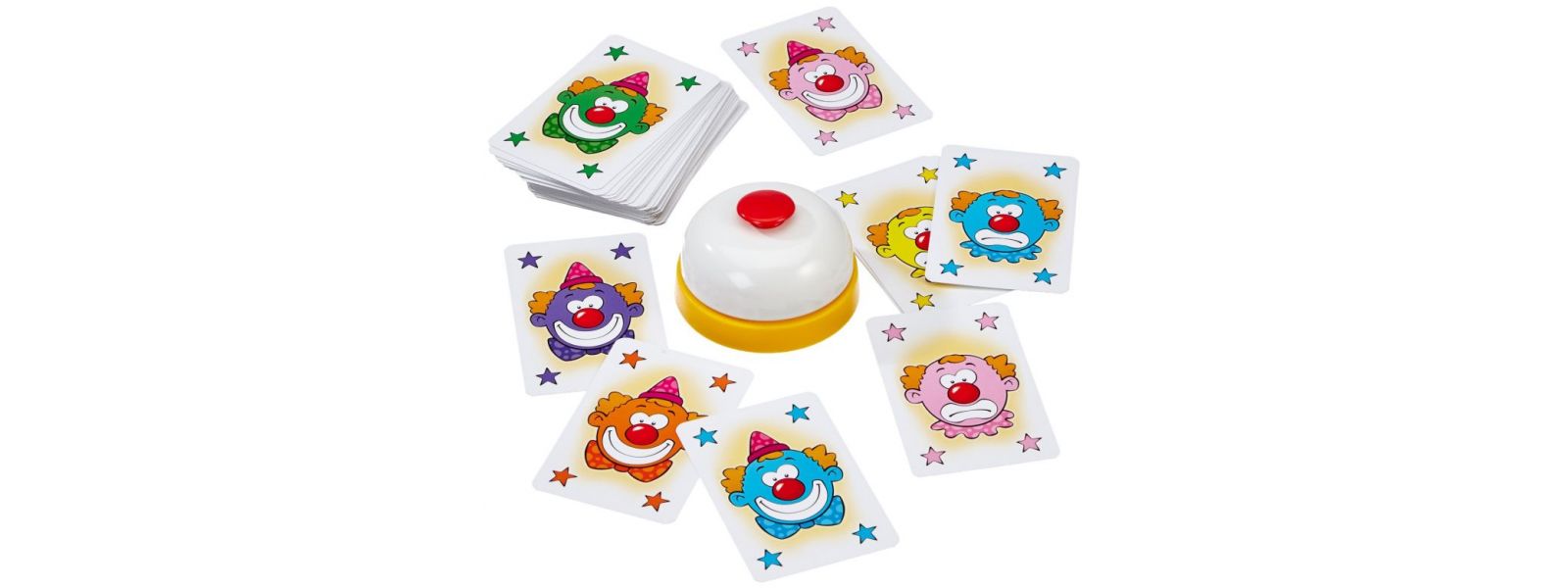 Sobald auf den offenen Kartenstapeln zwei gleichfarbige fröhliche Clowns zu sehen sind, müssen alle Spieler so schnell wie möglich auf die Glocke hauen.