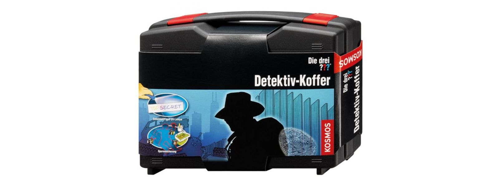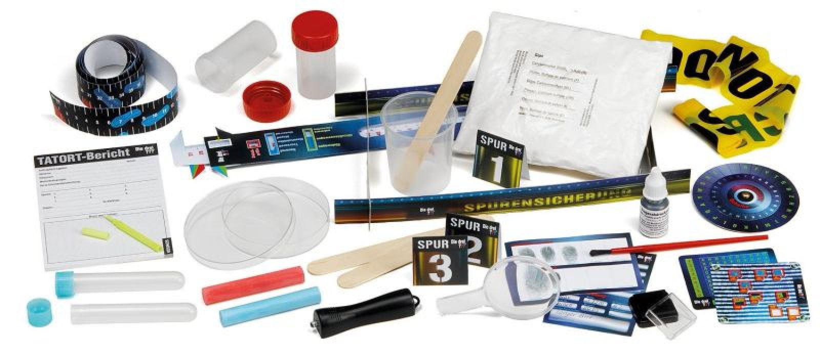 Inhalt: In einem Transport- und Aufbewahrungskoffer aus Kunststoff: UV-Lampe, Geheimstift, Fingerabdruckpulver und Klebefolien, Pinsel, Stempelkissen, Spurenbeutel, Probengefäße, Petrischale, Gips, Holzspatel, Messbecher, Pinzette, Lupe, Absperr- und Maßband, Kreide, Türsiegel-Aufkleber, Karteikartenbogen, Türschild, Detektivausweis, Ziffernschilder, Tatortblock, mehrere Codierscheiben und eine farbig illustrierte Anleitung
