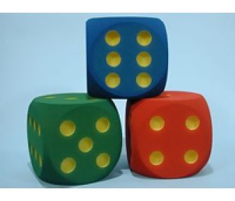 Würfel, 16 cm, aus Schaumstoff, Farben rot, blau und grün, mit gelben, ausgefrästen Punkten, abgerundete Ecken, lose in Karton