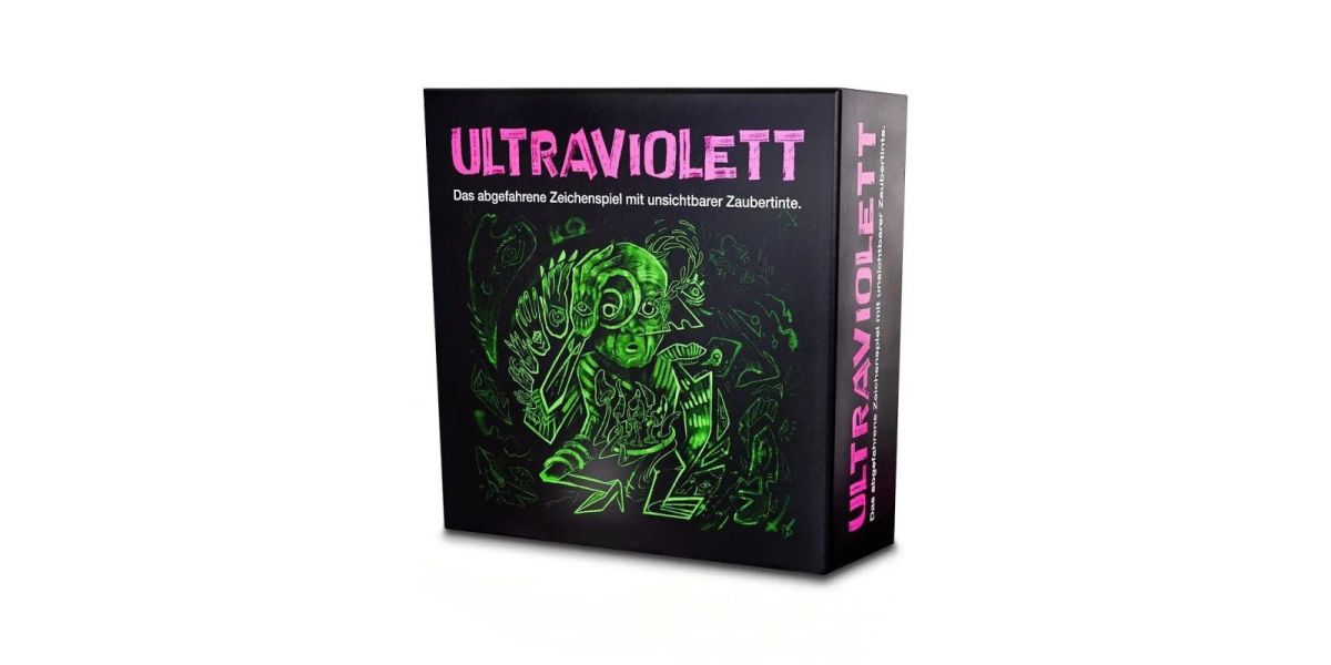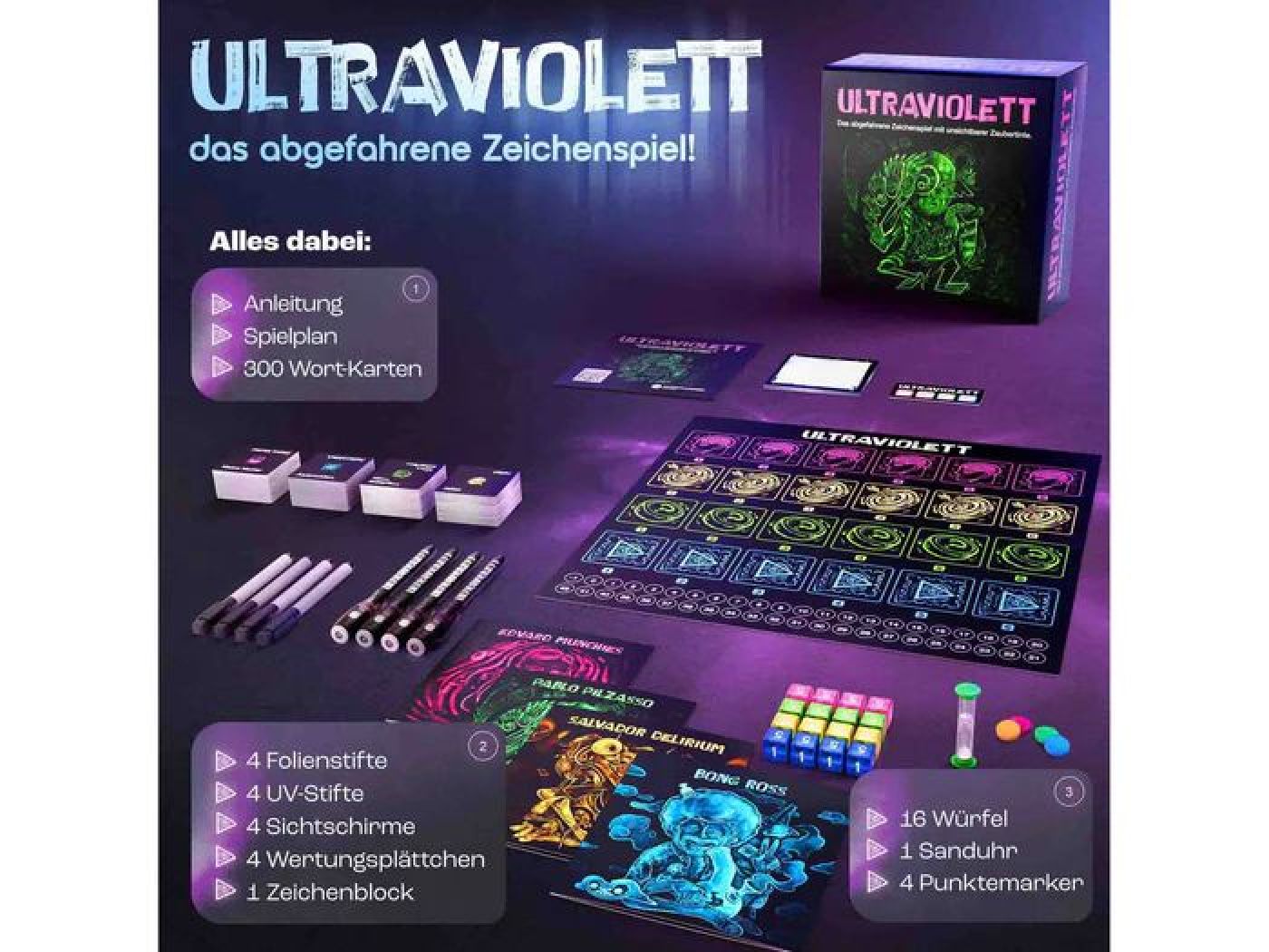 Schlüpf in die Rolle eines durchgeknallten Künstlers und zeichne absurde Sätze mit unsichtbarer Zaubertinte. Ultraviolett ist ein kompetitives und lustiges Mal-Rate-Partyspiel mit UV-Stiften für 3-4 Personen ab 12 Jahren, bei dem Talent keine Rolle spielt. Der einzigartige Spielmechanismus erfordert neben Humor und Kreativität auch taktisches Geschick. Alle würfeln gleichzeitig, niemand muss warten. Danach malt jeder sein unsichtbares Meisterwerk aus vier Satzfragmenten. Mit UV-Licht werden die Zeichnungen sichtbar und müssen von den Mitspielern erraten werden.