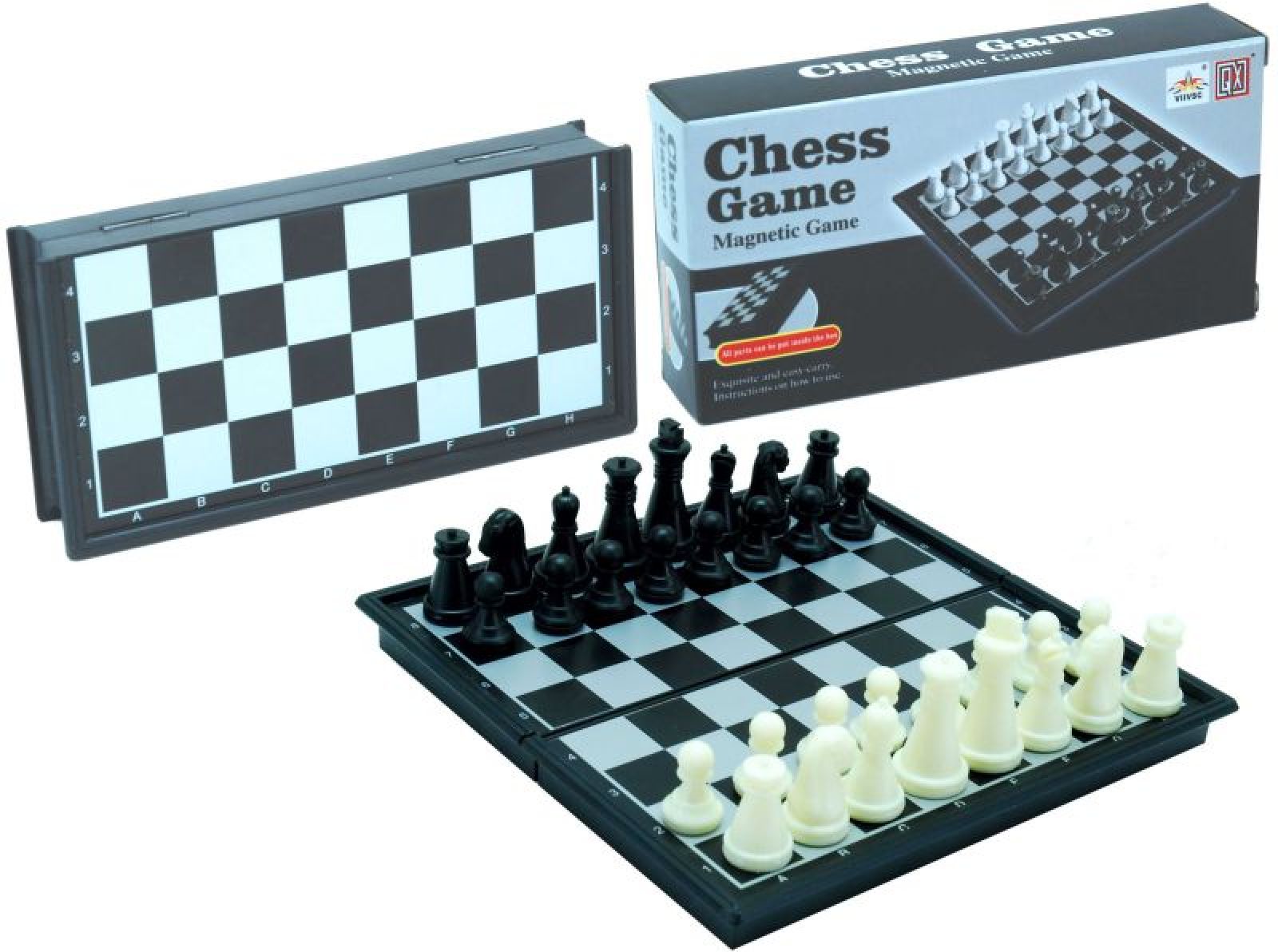 Schachkassette schwarz Kunststoff magnetisch. Spielfeld aus Metallplatte schwarz/silber B.+Z. Figuren aus Kunststoff Weiss/Schwarz. Abmessung geschlossen 13x6.5x2.4cm. Abmessungen offen 13x13x1.2 cm.