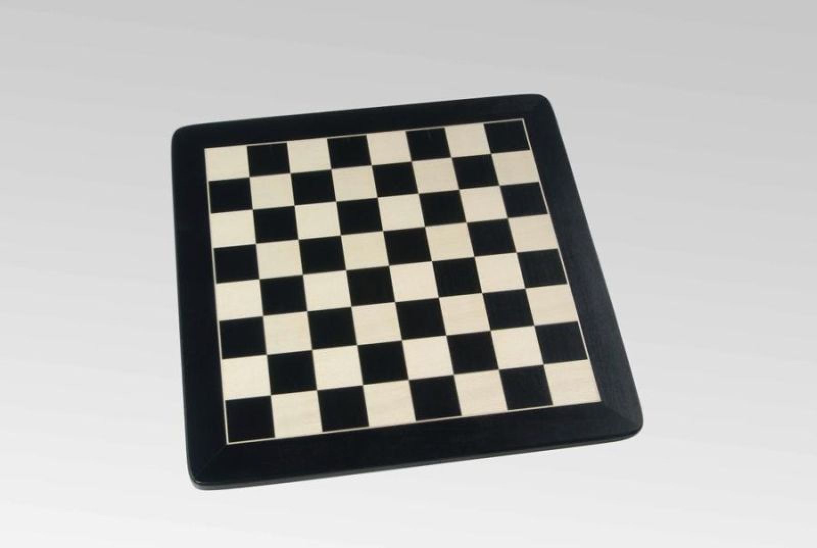 Handwerklich hochwertig verarbeitetes Schachbrett mit einem Spielfeld aus schwarzer Elsbeere und Ahorn mit umlaufender Zierader aus Ahorn und Elsbeererahmen.