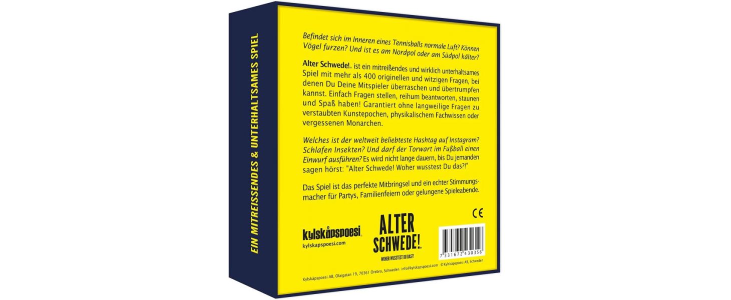 ALTER SCHWEDE! WOHER WUSSTEST DU DAS?!Befindet sich im Inneren eines Tennisballs normale Luft? Können Vögel furzen? Und ist es am Nordpol oder am Südpol kälter?Alter Schwede! ist ein mitreißendes und wirklich unterhaltsames Spiel mit mehr als 400 originellen und witzigen Fragen, bei denen Du Deine Mitspieler überraschen und übertrumpfen kannst. Einfach Fragen stellen, reihum beantworten, staunen und Spaß haben! Garantiert ohne langweilige Fragen zu verstaubten Kunstepochen, physikalischem Fachwissen oder vergessenen Monarchen. Welches ist der weltweit beliebteste Hashtag auf Instagram? Schlafen Insekten? Und darf der Torwart im Fußball einen Einwurf ausführen? Es wird nicht lange dauern, bis Du jemanden sagen hörst: "Alter Schwede! Woher wusstest Du das?!"Das Spiel ist das perfekte Mitbringsel und ein echter Entertainer für Partys, Familienfeiern oder gelungene Spieleabende.
