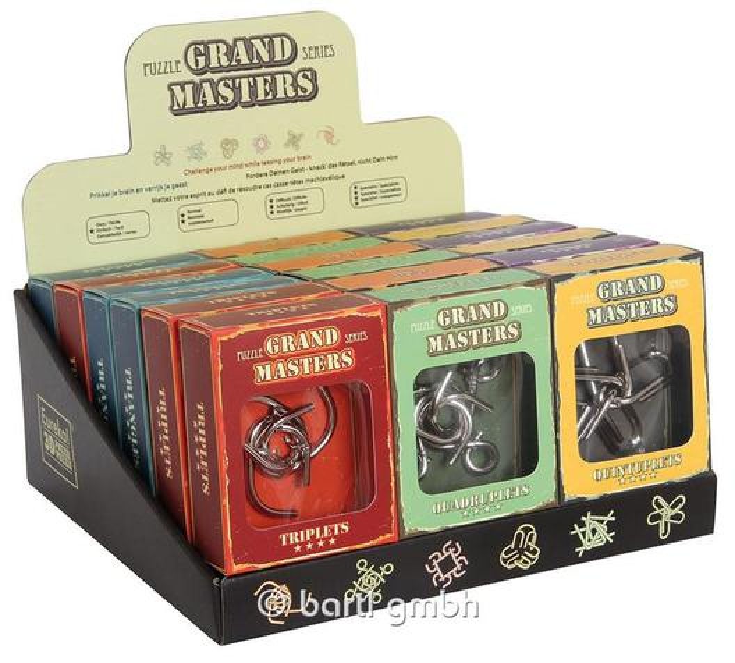 Extra schwierige Metallpuzzles in Geschenkkarton. 6 Designs a 3 Stück im Display.