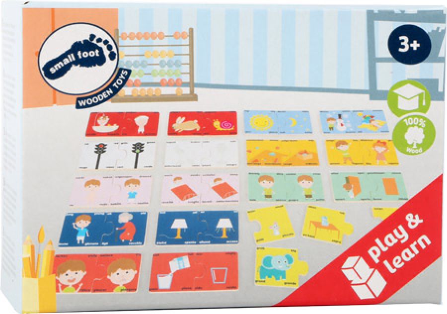 Was ist das Gegenteil von hell? Mit diesem niedlichen Lernpuzzle aus Holz lernen die Kleinen spielerisch Gegensätze kennen. Insgesamt 18 Sachverhalte sind wunderschön bebildert und warten darauf, in Paaren zusammengesetzt zu werden. Das Puzzle kann auch als Memo-Spiel verwendet werden. Das Legespiel fördert Konzentration, Feinmotorik und Sprachverständnis und ist eine tolle, spielerische Übung für zwischendurch. Die bunt bemalten Holzteile sind stabil und robust, so dass langer Spielspaß garantiert ist. Ein tolles Spiel zum Lernen und Erzählen!