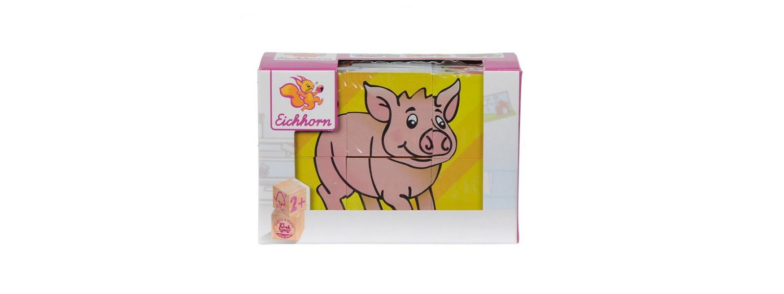 Eichhorn Bilderwürfel: Je nachdem wie man die Steine dreht entsteht mit den Eichhorn Bilderwürfeln eines der 6 Tier-Motive. Es kann ein Bild mit einem Schwein, Pferden, Hühnern, einem Schaf, einer Ziege oder einer Kuh gelegt werden. Die Bausteine dieses Artikels sind mit einer Kantenlänge von 3,5cm extra klein um das Legen der Motive interessanter für die Kinder zu gestalten. Für die Herstellung der Eichhorn Bilderwürfel wird ausschließlich FSC® 100% Holz aus vorbildlicher Forstwirtschaft verwendet. Die Bilderwürfel sind für Kinder ab 2 Jahren geeignet.