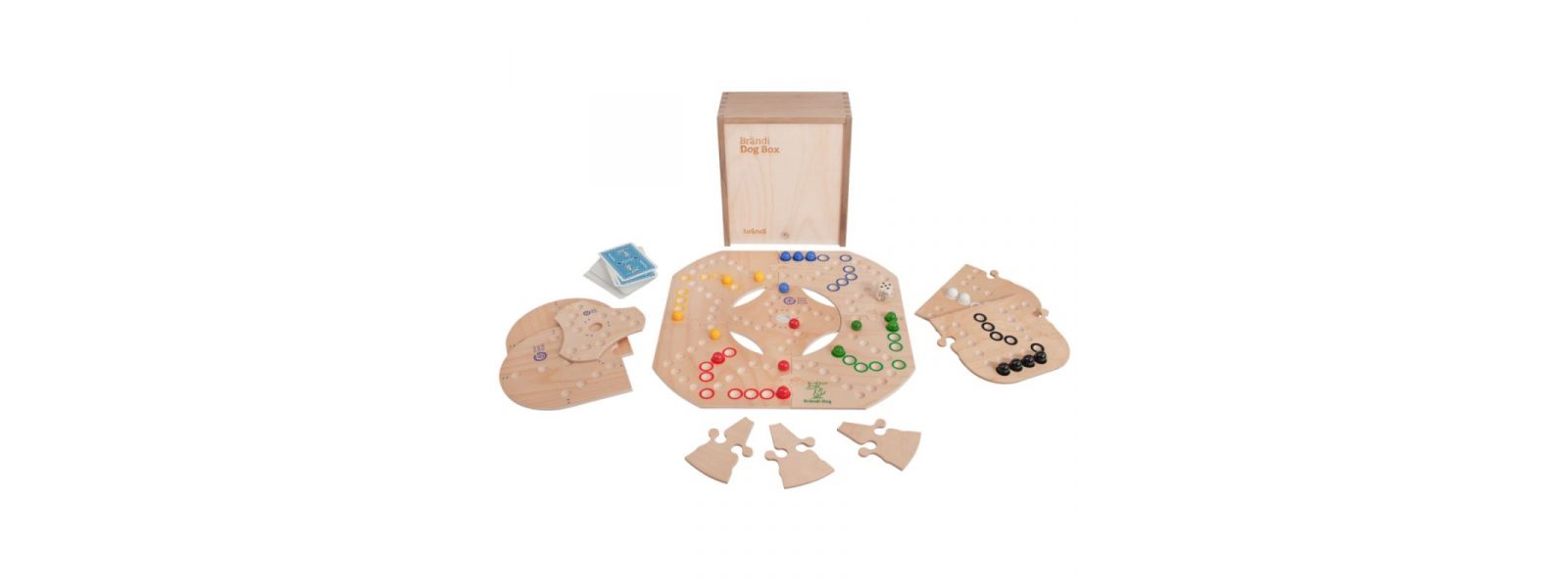 In der hochwertigen Brändi Dog Holzbox aus Nussbaum und Birkensperrholz finden die Brändi Dog Grundversionen und die Erweiterungen für 3 und 6 Spieler wie auch die ganze Brändi Dog PLUS Familie für 3,4 und 6 Spieler ihren Platz. Der verschiebbare Deckel ist magnetisch und verschliesst das Spiel einfach sicher. Die Box wie auch das Spiel werden in der Schreinerei der Stiftung Brändi hergestellt.