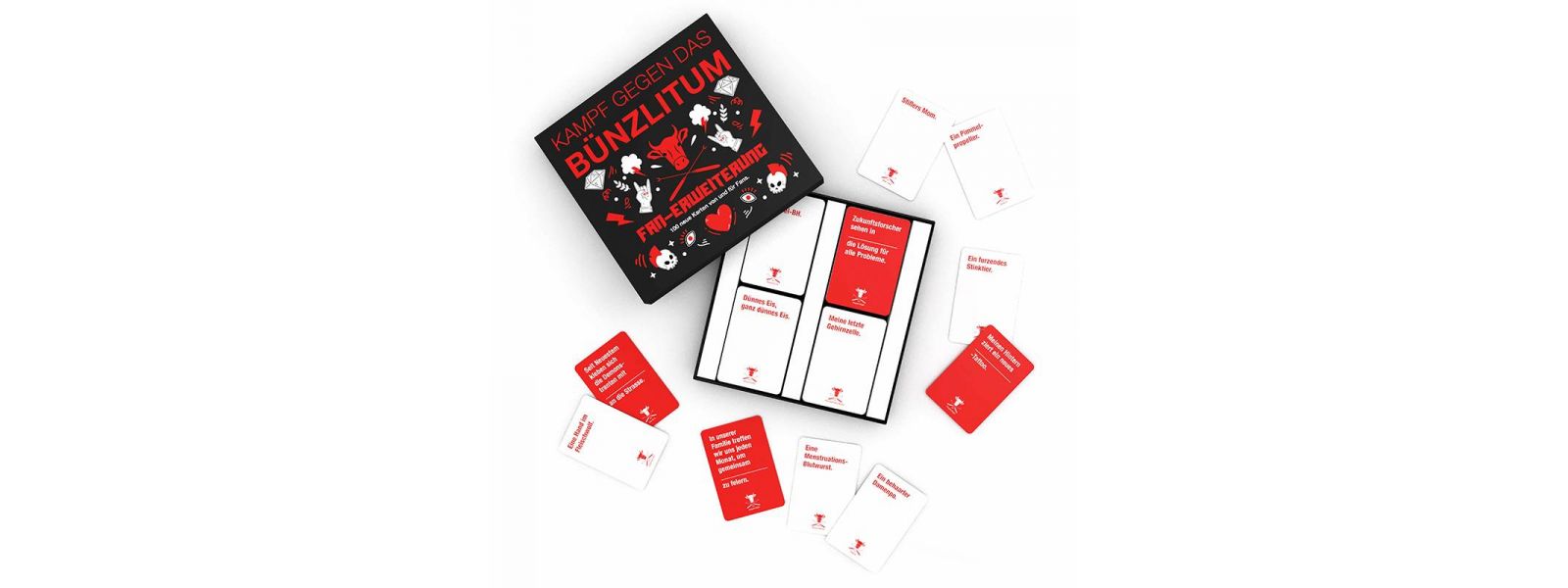 Die fünte Erweiterung zu "Kampf gegen das Bünzlitum" ist ab sofort erhältlich! Bei unserer ersten Erweiterung baten wir euch um Vorschläge mit euren eigenen Lieblingsbegriffen. Bei der "Fan"-Erweiterung haben wir aus allen Einsendungen die besten Karten ausgewählt nach den Kriterien Aktualität, Witzigkeit und Kampfhummel-Manier (Fiesheit). Daraus ist dieses Prachtstück entstanden. Diese 100 Karten sind mindestens so gut wie unsere eigenen Kreationen und dürfen in deiner Sammlung auf keinen Fall fehlen.