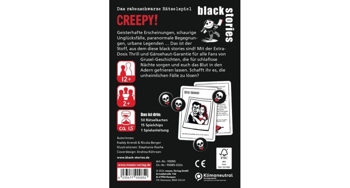 black stories - Das ist DIE Kultreihe bei moses. und das schon seit 20 Jahren! In den morbiden, gruseligen, und mitunter urkomischen Rätseln geht es um besonders tückische Todesarten und skurrile Unfälle. Im Team gilt es, herauszufinden, was genau passiert ist. Nicht immer ganz so einfach.