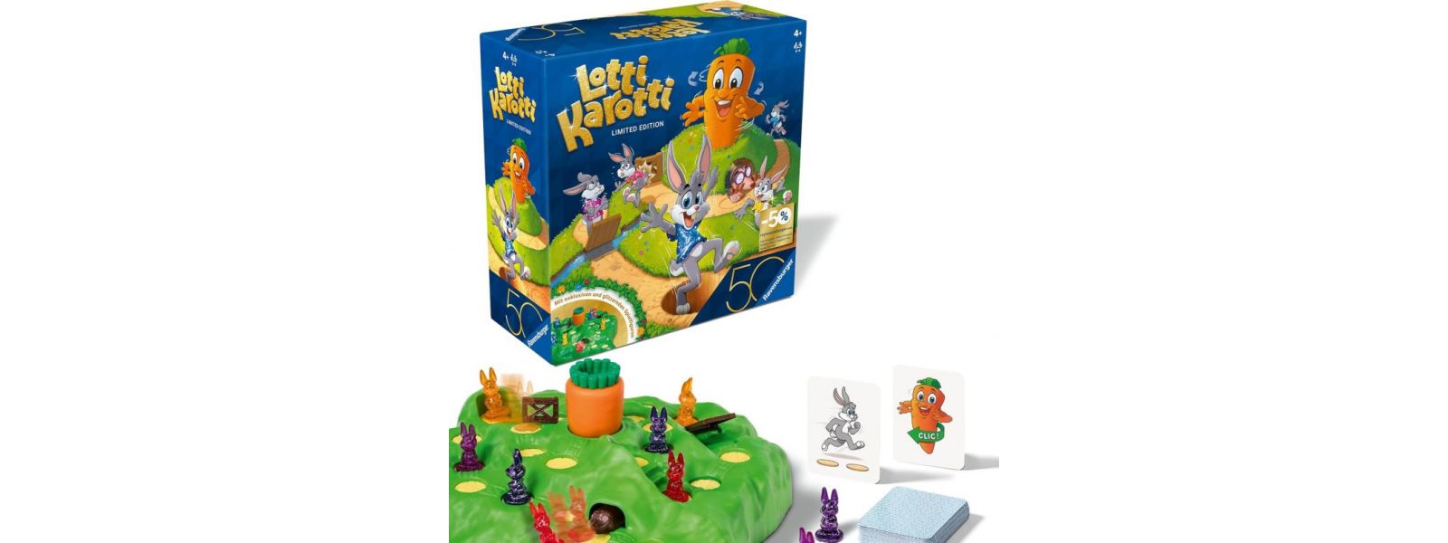Ravensburger feiert 50 Jahre Blaues Dreieck. In dieser Jubiläums-Edition laufen 16 wunderschön glitzernde Hasenfiguren um die Wetter. Diese gibt es exklusiv nur in dieser Edition