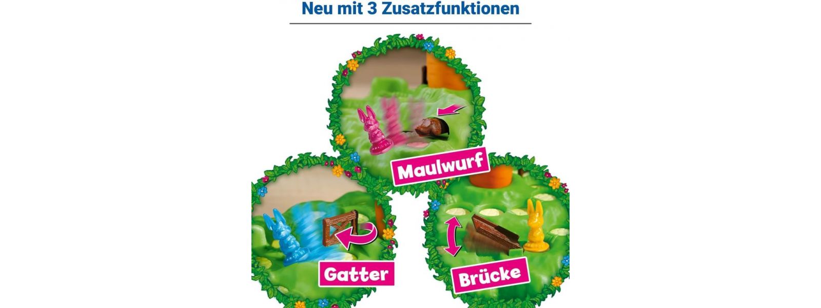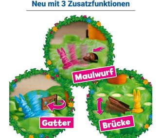 Außerdem erschweren die drei Hindernisse den Weg zur Karotte: der Maulwurf schubst die Hasen vom Hügel, die Zugbrücke kann man nur nach unten geklappt überqueren und das Gatter schiebt die Hasen eine Ebene den Hügel hinab