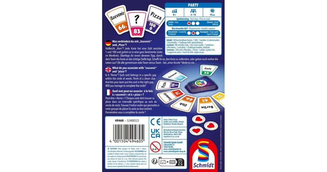 Was verbindest du mit "Souvenir" und "Pizza"? Vielleicht "Rom"? Jede Karte hat eine Zahl zwischen 1 und 100 und gehört so in eine ganz bestimmte Lücke im Wortkreis. Überlege dir einen cleveren Tipp, damit dein Team die Karte an die richtige Stelle legt. Schafft ihr es, den Kreis zu vollenden, oder gehen euch vorher die Leben aus? Ob alle gemeinsam oder Team versus Team - bei einer Runde bleibt es nie...