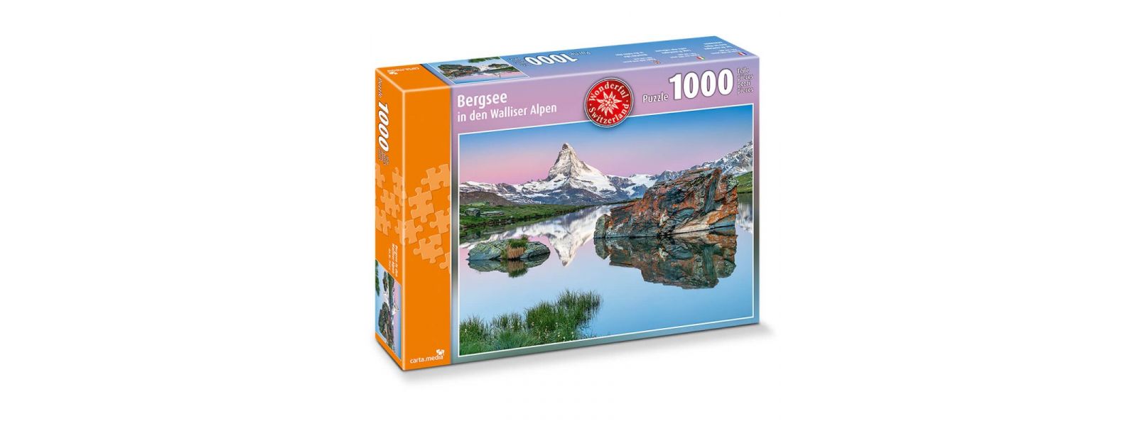 Puzzle mit 1’000 Teilen im Format 70 x 50 cm. Bergsee in den Walliseralpen. Der Stellisee auf 2537m ü.M. ist der grösste und bekannteste einer südöstlich von Zermatt gelegenen Gruppe von fünf Seen. Die zahlreichen Besucher aus aller Welt fotografieren insbesondere den Stellisee millionenfach wegen der klaren und atemberaubend schönen Spiegelung des Matterhorns in seinem Wasser.