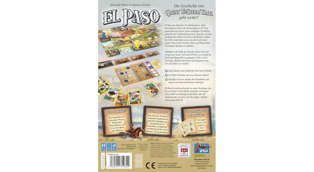 Schlüpft in die Rolle der Rancher dieser Zeit und und bringt euer bestes Vieh nach El Paso, um schnell an Geld und Siegpunkte zu gelangen. Stellt weitere Cowboys, Handwerkerinnen und Ingenieure ein, um eure Ziele zu erreichen.
