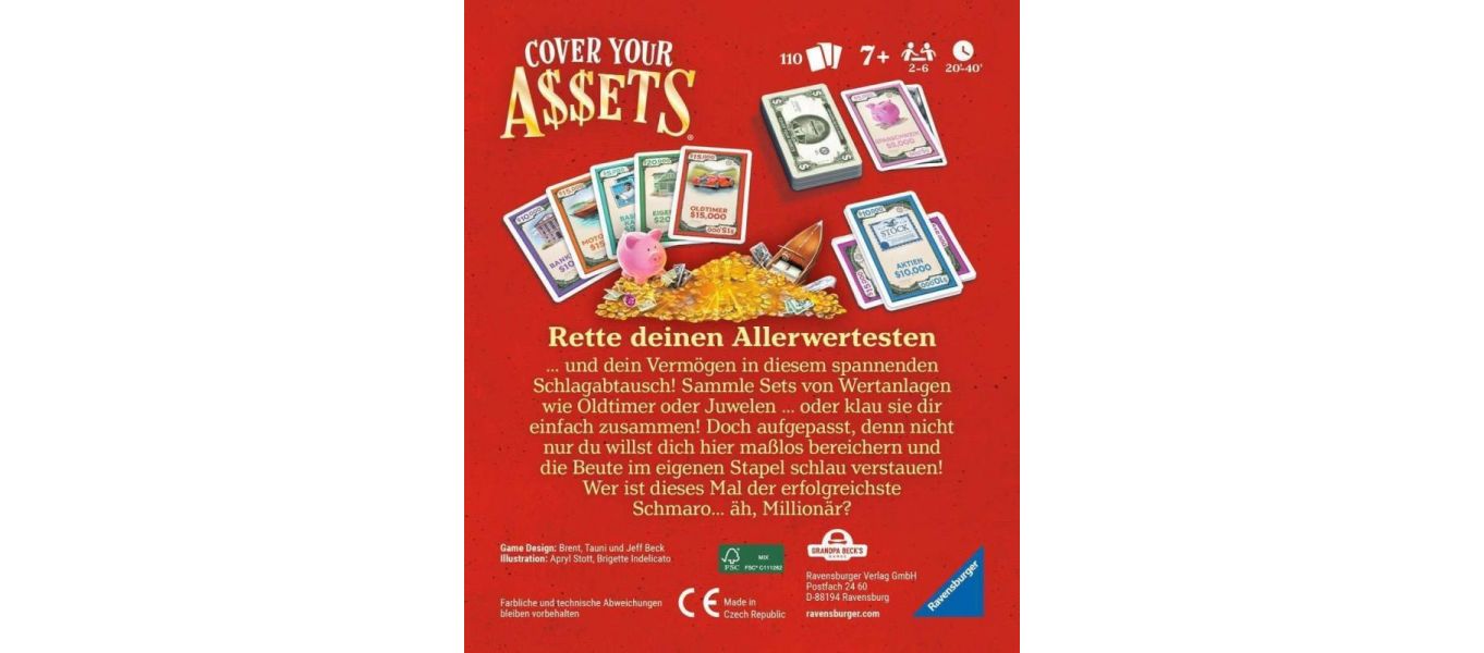 Cover your Assets ist ein einfaches Kartenspiel, bei dem man Paare aus gleichen Wertanlagen bildet. Entweder sammelt man diese oder aber man luchst sie seinen Mitspielern geschickt ab! Dabei sollte man seine eigenen Wertanlagen nicht aus den Augen lassen und möglichst schnell mit neuen Wertgegenständen vor den anderen schützen.
