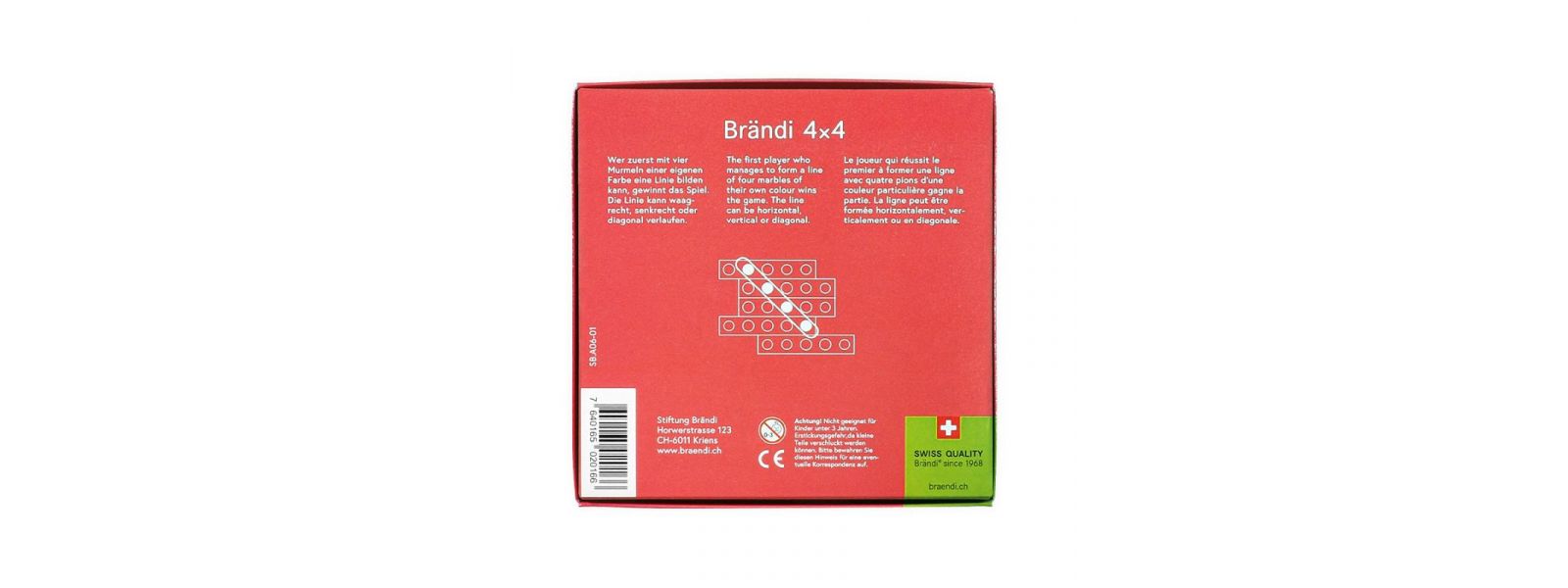 Brändi 4x4 heisst das Spiel aus dem Hause Brändi bei dem die Zahl 4 im Mittelpunkt steht. Setzen, schieben, clever kombinieren - und wer zuerst vier Murmeln in einer Reihe hat, hat’s geschafft! Egal ob waagrecht, senkrecht oder diagonal, Hauptsache vier am Stück. Ideal für eine schnelle Spielrunde zwischendurch!