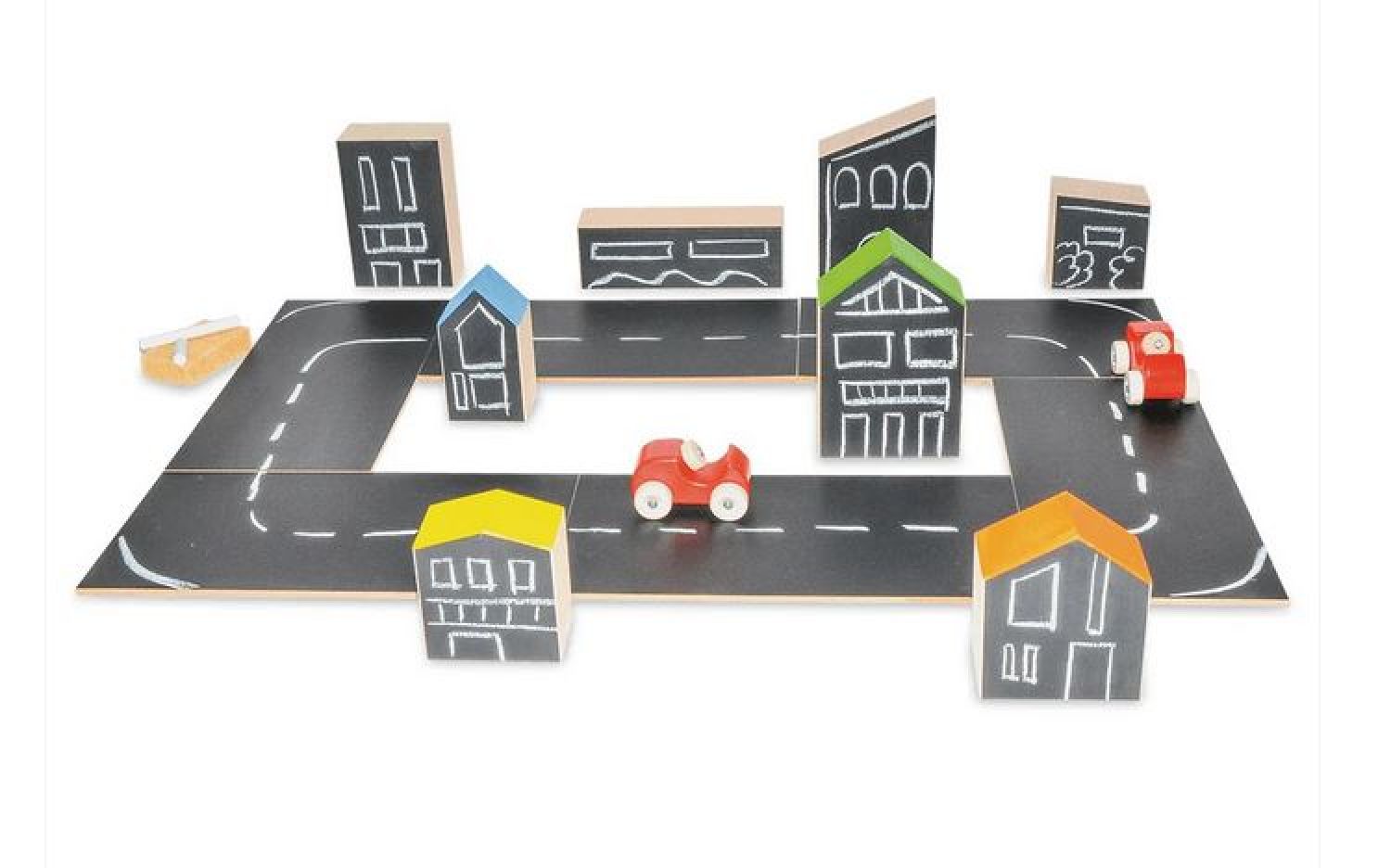Mit der Kreidestadt wird das Kind zum Stadtplaner. Die Strassen und Häuser werden nach Belieben angeordnet und mit Kreide bemalt. Mit einem nassen Schwamm können die Markierungen wieder weggewischt werden und die Planung beginnt von vorne. Strassenabschnitte magnetisch. Set inkl. 2 Autos, Kreide und Schwamm.