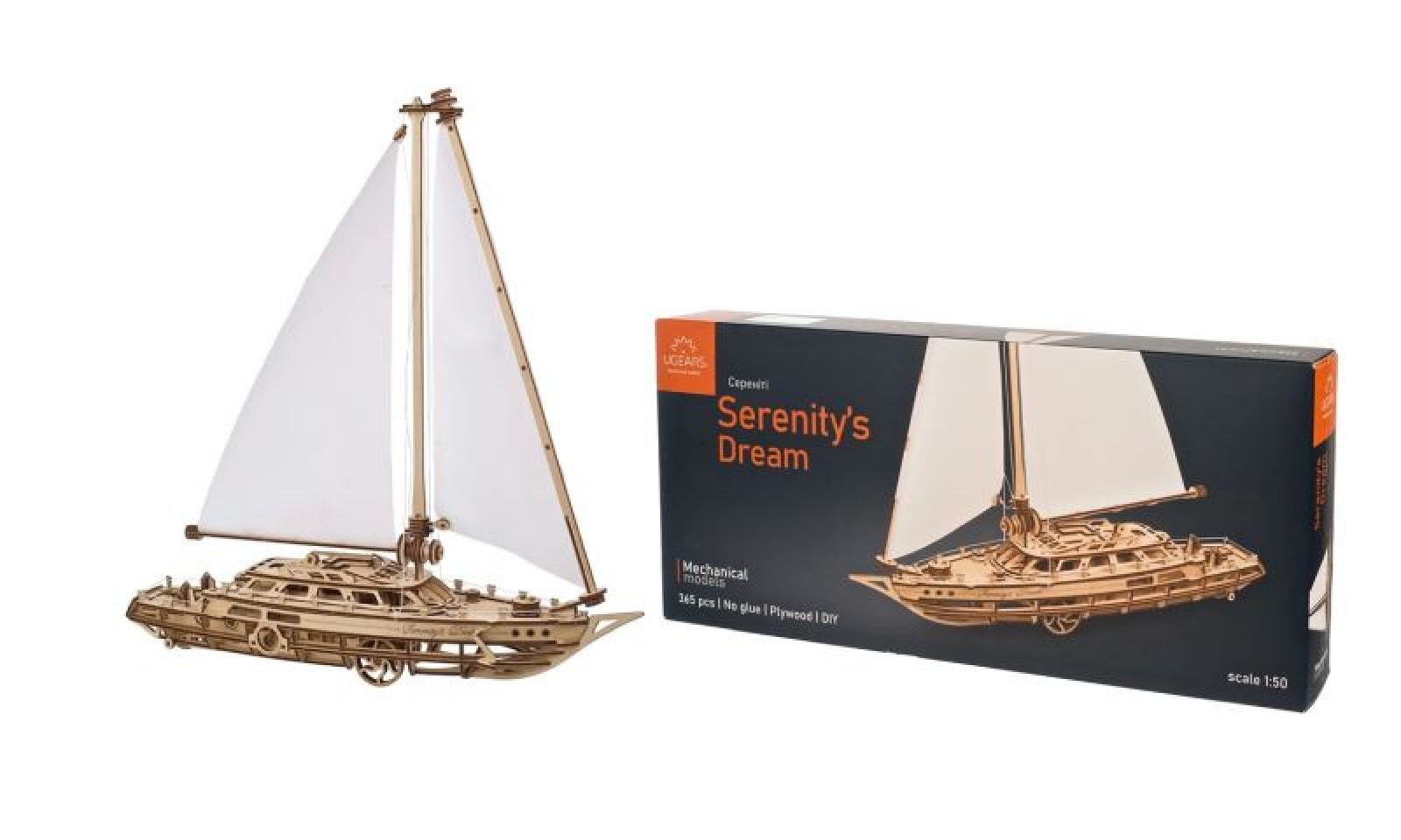 Serenity's Dream reiht sich neben der Ocean Beauty Yacht und dem Trimaran Merihobus in die Ugears-Flotte der DIY-Modellsegelschiffe ein. Im Gegensatz zu diesen statischen Modellen ist Serenity's Dream jedoch ein federbetriebenes Aufziehboot, das eine Reihe von Wendemanövern über eine Strecke von bis zu 4 m über eine ebene Fläche ausführen kann. Stellen Sie den Start/Stop-Schalter, der sich auf dem Dach der Kabine befindet, auf die Position ""Stop"". Nehmen Sie den Wickelschlüssel aus dem Vorschiff, stecken Sie ihn in den Ratschenmechanismus am Steuerbordrumpf und drehen Sie ihn mehrmals. Stecken Sie den Wickelschlüssel wieder in das Deck, stellen Sie das Boot auf eine ebene Fläche, stellen Sie den Start/Stop-Schalter auf die Position ""Start"" und beobachten Sie, wie Ihre Yacht lossegelt und eine Reihe von anmutigen Zick-Zack-Wendemanövern ausführt.