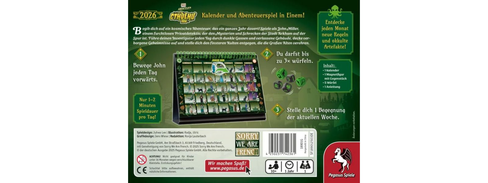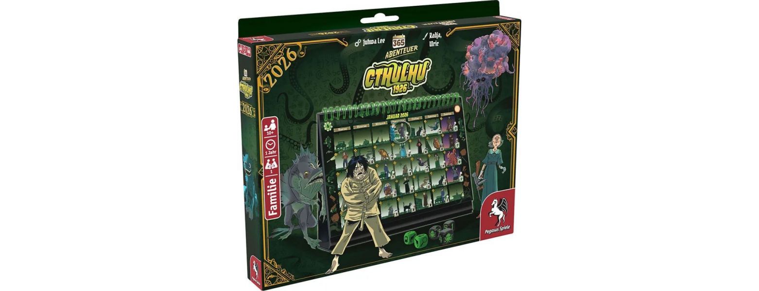 Gerüchte über mysteriöse Kreaturen und dunkle Kulte häufen sich in der rätselhaften Stadt Arkham. Doch der Privatdetektiv John Miller ist bereit, mit Pistole und Taschenlampe in die Dunkelheit einzutauchen und den Geheimnissen auf die Spur kommen Mit 365 Adventures Cthulhu 1926 schlüpfen die Spielenden für ein ganzes Jahr lang in die Rolle des Privatdetektivs John Miller und begeben sich auf ein kosmisches Abenteuer, das sie in dunkle Gassen und verlassene Gebäude der mysteriösen Stadt Arkham führt. Jeden Tag handeln sie eine neue Begegnung ab und entdecken neue verborgene Geheimnisse um finstere Kulte, die die Großen Alten verehren. Für jede erfolgreich besiegte Sonderbegegnung am Sonntag gibt es Punkte, aber jeden Tag steigt auch die Wahrscheinlichkeit, wahnsinnig zu werden ... Zu Beginn jedes neuen Monats erfahren die Spielenden, wie Johns Geschichte weitergeht. Außerdem kommen nun auch neue Regeln oder magische Artefakte ins Spiel. Für ihr tägliches Abenteuer brauchen die Spielenden maximal 5 Minuten und das Spielprinzip von 365 Adventures Cthulhu 1926 ist schnell erklärt: Zunächst wird der magnetische Held auf dem Kalender zum aktuellen Tag bewegt, dann dürfen die Spielenden bis zu drei Mal würfeln, um eine Begegnung der aktuellen Woche abzuhandeln. Am Ende des Monats, zählen sie die erreichten Punkte zusammen und betreten das nächste Kapitel in der Stadt voller Rätsel und uralter Geheimnisse.