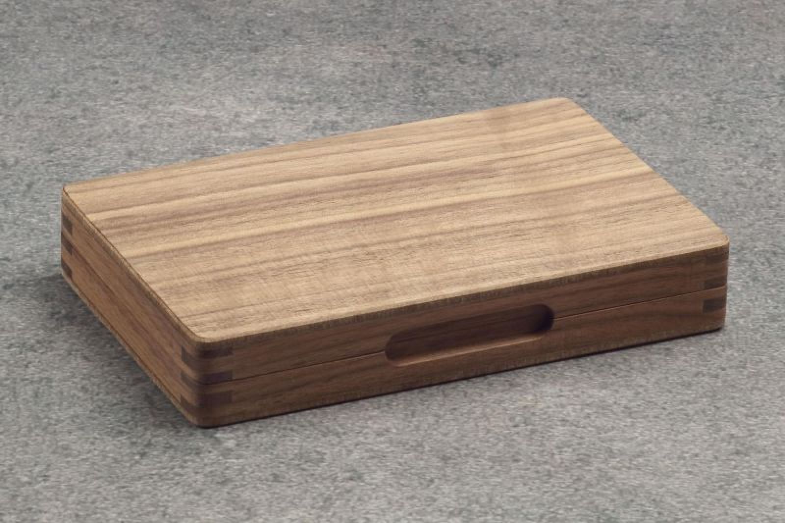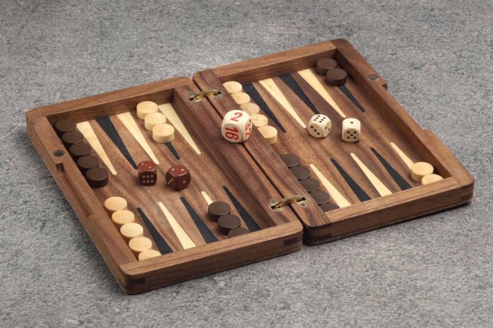 Handwerklich hochwertig verarbeitetes, magnetisches Reisebackgammon in feinem Nussbaumholz. Der Koffer ist aus massivem Nussbaum mit verzinkten Eckverbindungen. Spiel- und Deckflächen sind furniert, die Beschläge sind verdeckt eingearbeitet. In das Backgammon-Spielfeld werden in aufwendiger Intarsienarbeit kontrastreiche helle und schwarze Zungen eingelegt. Um ein harmonisches Gesamtbild zu erhalten, sind die Spitzen der Zungen abgerundet.