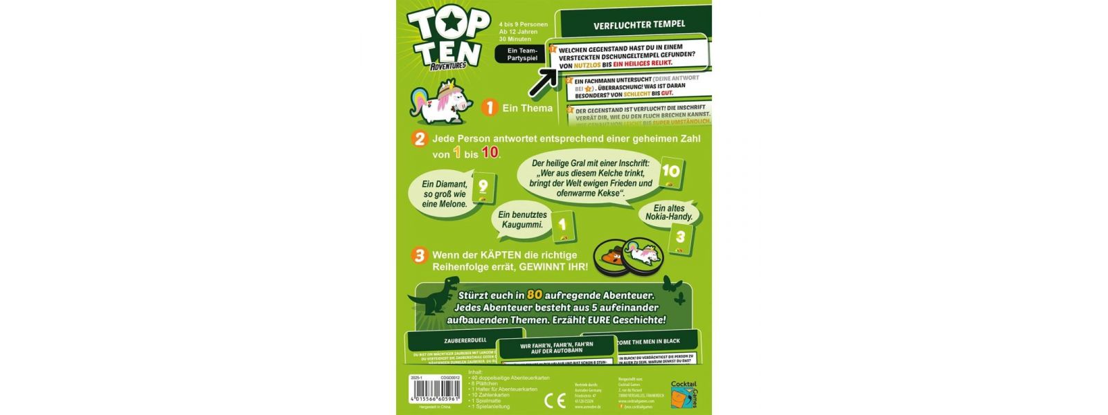 Mit Top Ten Adventures erwartet euch ein epischer Ableger des Party-Klassikers! Dieses Mal erlebt ihr 80 verschiedene Abenteuer mit fünf aufeinanderfolgenden Themen, die eine zusammenhängende Geschichte erzählen. Von Runde zu Runde, in denen der Käpten die absurden Antworten seiner Mitspieler in die richtige Reihenfolge bringen muss, erkundet ihr einen neuen Abschnitt des Abenteuers. Dabei müsst ihr euch manchmal auf die Antworten beziehen, die ihr zuvor gegeben habt, was für viele aberwitzige Momente sorgt. Macht euch bereit für Lachtränen und Zwerchfell-Muskelkater mit Top Ten Adventures!