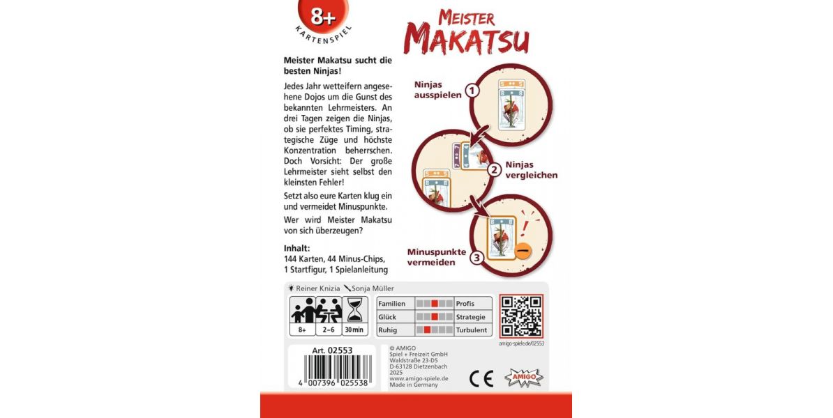 Meister Makatsu Meister Makatsu sucht die besten Ninjas! Jedes Jahr wetteifern angesehene Dojos um die Gunst des bekannten Lehrmeisters. An drei Tagen zeigen die Ninjas, ob sie perfektes Timing, strategische Züge und höchste Konzentration beherrschen. Doch Vorsicht: Der große Lehrmeister sieht selbst den kleinsten Fehler! Um Minuspunkte zu vermeiden, müssen die Karten klug eingesetzt werden. Wer wird Meister Makatsu von sich überzeugen? Ein schnell erlerntes Kartenspiel von Erfolgsautor Reiner Knizia mit lustig-originellen Illustrationen. So spielt man Meister Makatsu MBE3: * Alle erhalten ein Deck mit 24 Karten. Dieses besteht aus Karten mit den Werten von 1-8 in 3 verschiedenen Farben. * Das Spiel verläuft in 3 Durchgängen mit jeweils unterschiedlich vielen Runden. * In jeder Runde zieht ihr 4 Handkarten und spielt nacheinander zwei Karten vor euch aus. * Danach vergleicht ihr eure ausgespielten Karten untereinander: Wer den höchsten Wert einer Farbe gespielt hat, erhält Minuspunkte-Chips. Im ersten Durchgang verteilt ihr Chips mit 1 Minuspunkt, im zweiten Chips mit 2 Minuspunkten und im dritten Chips mit 3 Minuspunkten. * Die zwei Karten, die ihr nicht ausspielt, legt ihr verdeckt zur Seite. Mit diesen abgelegten Karten werdet ihr die nächsten Durchgänge spielen. * Wer nach drei Durchgängen die wenigsten Minuspunkte gesammelt hat, gewinnt!