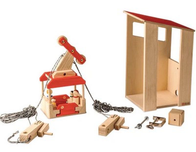 Gesamtes Seilbahnset zum Überwinden von grossen Distanzen, bestehend aus Steilbahnstation, Personengondel inkl. Figuren, Seil, Kurbel.