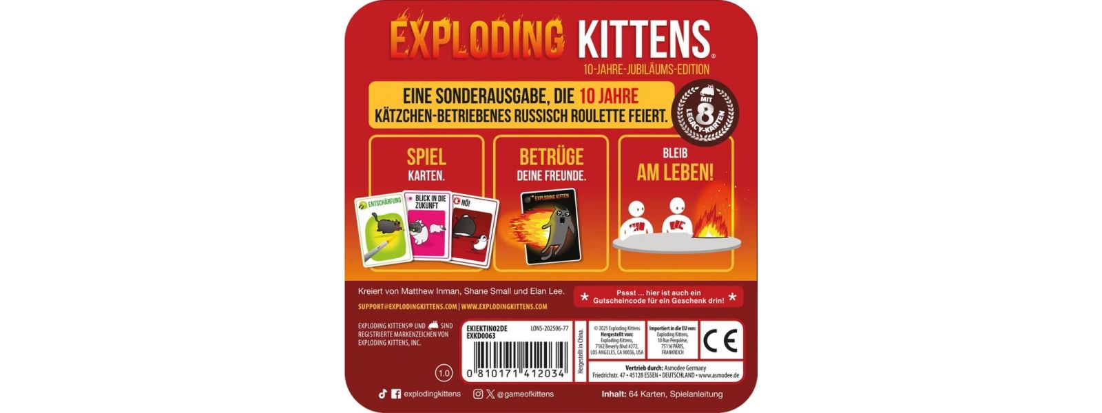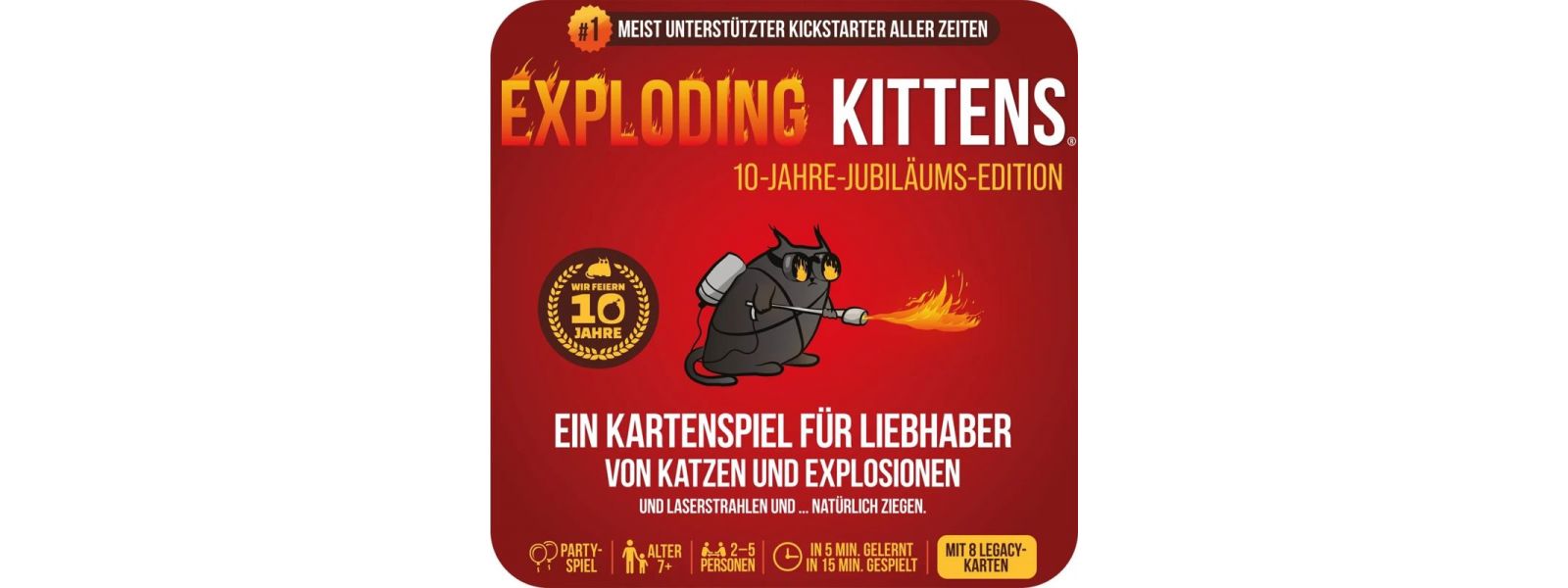 Der erfolgreiche Kickstarter jetzt als 10-Jahre-Jubiläums-Edition in der stylischen Blechdose mit 8 Legacy-Karten! Wer das familienfreundliche Partyspiel kennt und ein Fan ist, der weiß, wie es funktioniert. Doch hier noch mal für alle anderen: Ihr zieht reihum Karten, bis einer ein Exploding Kitten zieht. Derjenige explodiert sofort, stirbt und scheidet aus - es sei denn, er hat eine Karte zur Entschärfung. Mit ihr kann er das Kätzchen beruhigen und vom Explodieren abhalten, zum Beispiel mithilfe eines Laserpointers, durch Katzenminze oder Bauchkraulen. Alle anderen Karten dienen nur einem Zweck: zu verhindern, dass man ein Exploding Kitten zieht.