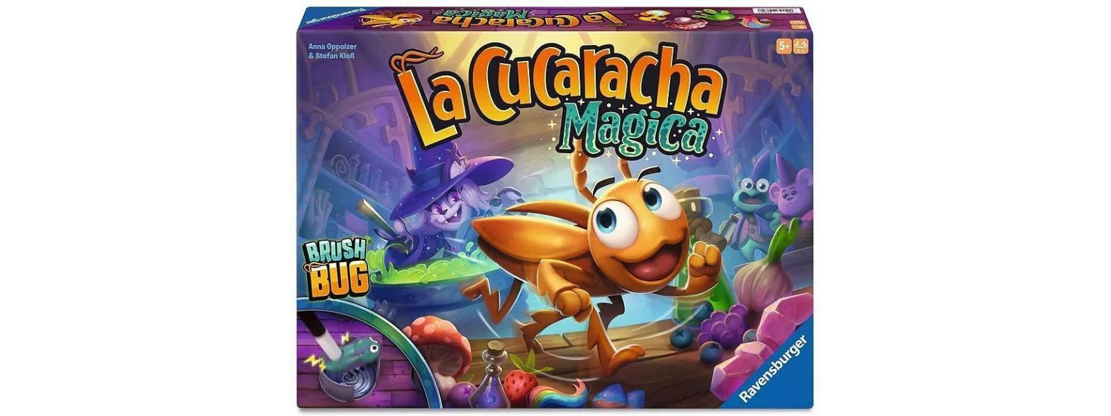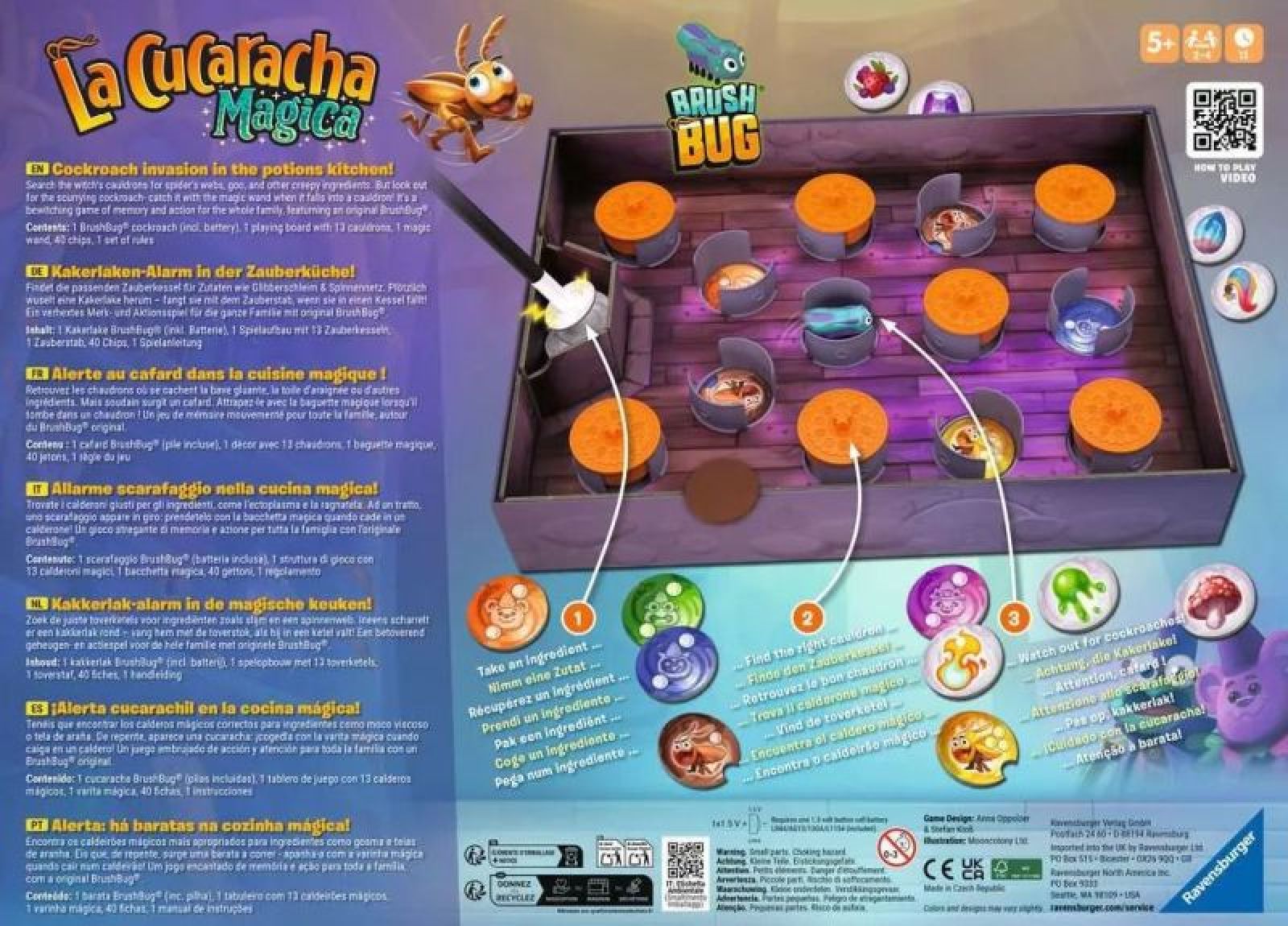 Eines Nachts im Zauberwald, die Hexen brauen ihre Tränke. Aber was war das? Plötzlich wuselt eine Kakerlake zwischen den Zauberkesseln herum! Fällt sie in einen Trank, ist dieser verdorben. Schwingt den Zauberstab und findet die richtigen magischen Zutaten! Gewonnen hat, wer die meisten Punkte für erfolgreich gebraute Tränke sammeln konnte. Das Wasser kocht schon in den Zauberkesseln. Jetzt fehlen nur noch die richtigen magischen Zutaten! Wo war nochmal der mächtige Kristall? Und wo habt ihr das Spinnennetz hingelegt?! Was für ein Chaos, jetzt wuselt auch noch eine Kakerlake zwischen den Zauberkesseln herum! Findet die richtigen magischen Zutaten. Wer kann sich am besten merken, in welchen Kessel welche magische Zutat gehört? Behaltet außerdem die Kakerlake im Auge! Fällt sie in einen Kessel, wird euer magischer Trank verdorben. Schnell, holt die Kakerlake mit dem magischen Zauberstab aus dem Kessel raus und deckt einen Kakerlaken-Chip auf. Wurde euer Trank zu verdorbener Brühe? Dann bekommt ihr leider keinen Punkt für diesen Trank. Oder hattet ihr Glück und die Kakerlake hat den Trank in den seltenen goldenen Kakerlakentrank verwandelt? Wer für fertig gebraute Tränke die meisten Punkte sammelt, gewinnt!