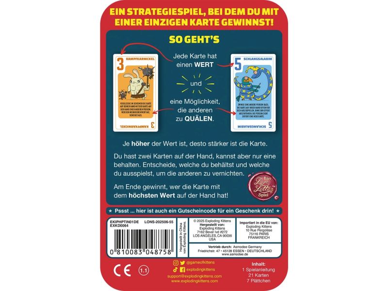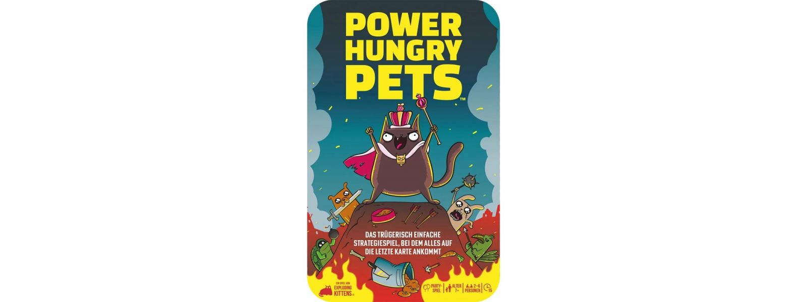 Im trügerisch einfachen Partyspiel Power Hungry Pets treffen zwei Legenden aufeinander: Love Letter und Exploding Kittens. Jede Karte hat einen Wert und eine Möglichkeit, die anderen Spieler zu quälen. Je höher der Wert ist, desto stärker ist die Karte. Du hast zwei Karten auf der Hand, kannst aber nur eine behalten. Entscheide, welche du behältst und welche du ausspielst, um die anderen zu vernichten. Am Ende gewinnt, wer die Karte mit dem höchsten Wert auf der Hand hat. Kannst du es schaffen, den Katzenkönig durchzubringen?
