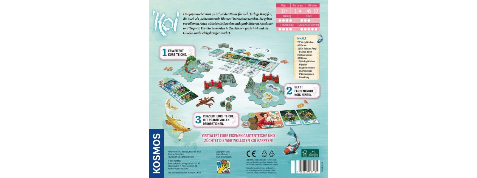 Gestaltet euren eigenen Zierteich, setzt Kois ins Wasser und lasst nach und nach eine lebendige Landschaft entstehen. Jede Entscheidung beeinflusst das Zusammenspiel von Platzierung, Umgebung und Wertung. Wählt Karten gezielt, plant eure Züge voraus und entwickelt euren Teich Schritt für Schritt weiter. Wer Timing und Strategie am besten kombiniert, gestaltet das erfolgreichste Gewässer.