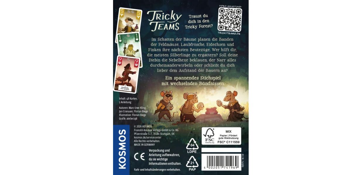 Traust du dich in den Tricky Forest? Im Schatten der Bäume planen die Banden der Feldmäuse, Laubfrösche, Eidechsen und Finken ihre nächsten Beutezüge. In jeder Stichrunde entstehen neue Allianzen, und jede Entscheidung kann den Spielverlauf verändern. Vier gewitzt illustrierte Tierteams mit Zahlenwerten von eins bis zehn und besonderen Fähigkeiten sorgen für überraschende Wendungen. Wer sich im richtigen Moment dem Gewinnerteam anschließt, sammelt Silberlinge. Schnelle Runden halten die Spannung hoch und machen das Spiel zu einem unterhaltsamen Erlebnis für Stichspielfans, Familien, Freundeskreise und alle, die eine Portion Teamgeist mit etwas Strategie verbinden möchten. Nach vier Beutezügen entscheidet sich, wer die meisten Silberlinge gehortet hat.