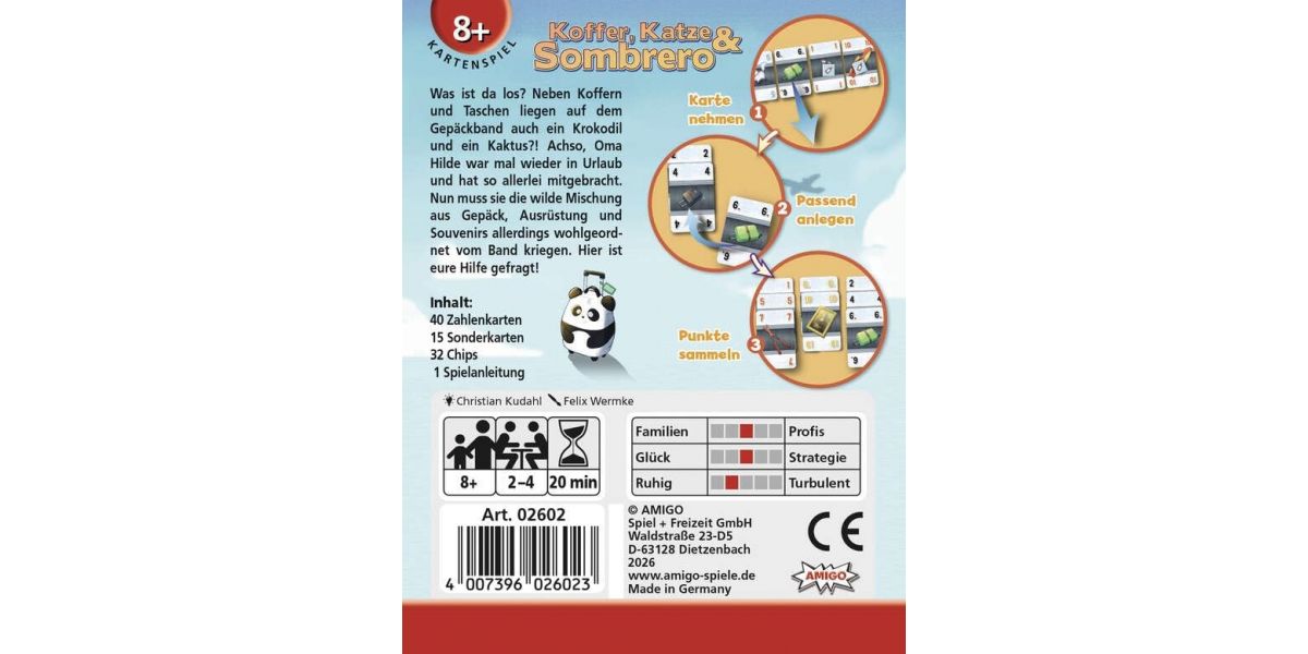 Koffer, Katze & Sombrero Was ist da los? Neben Koffern und Taschen liegen auf dem Gepäckband auch ein Krokodil und ein Kaktus?! Achso, Oma Hilde war mal wieder in Urlaub und hat so allerlei mitgebracht. Nun muss sie die wilde Mischung aus Gepäck, Ausrüstung und Souvenirs allerdings wohlgeordnet vom Band kriegen. Hier ist Unterstützung gefragt! Es gilt, möglichst viele Gepäckstücke nach Grösse und Farbe sortiert zu sammeln, um die meisten Punkte zu machen. Wem das am besten gelingt, gewinnt nicht nur Oma Hildes Dankbarkeit, sondern auch dieses raffinierte Kartenspiel. So spielt man Koffer, Katze & Sombrero MBE3:
