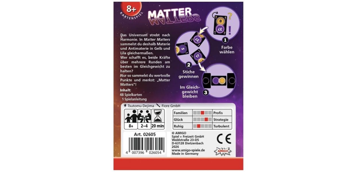 Dafür müssen sie sich vor jeder Runde entscheiden, welche der beiden Farben sie ausspielen, um den Stich zu gewinnen. Nur wer es schafft, beide Kräfte über mehrere Runden am besten im Gleichgewicht zu halten, kann am Ende gewinnen. Denn so werden wertvolle Punkte gesammelt und man merkt: Matter Matters - Materie ist wichtig!