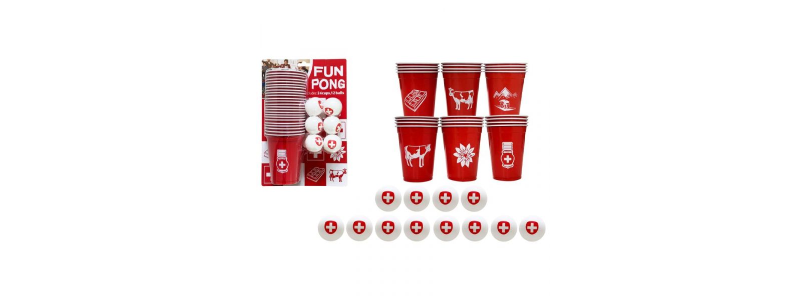 Trinkspiel Fun Pong 36 Teile, 24 Becher und 12 Bälle in der Switzerland Edition.