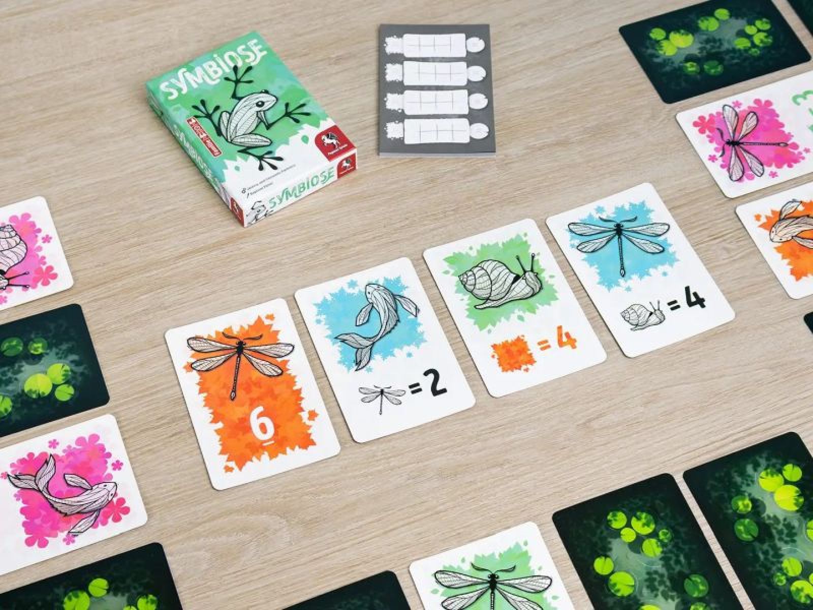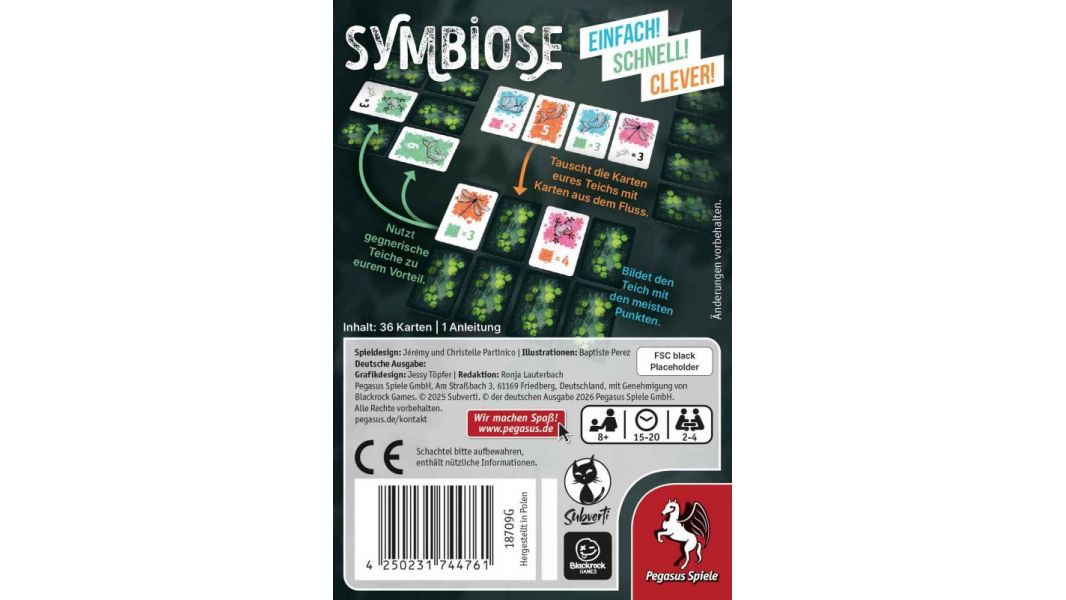 Symbiose kann auch im Duell-Modus 1 gegen 1 gespielt werden oder im Team-Modus 2 gegen 2. Außerdem ist das Teichbauspiel Teil der Spielreihe Einfach! Schnell! Clever!