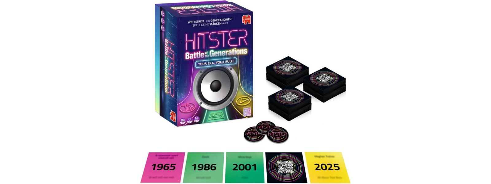 Bringe den Generationen‑Battle auf deine nächste Party mit Hitster: Battle of the Generations, dem ultimativen Musik‑Ratespiel für alle Altersgruppen. Mit 420 Musikkarten aus drei ikonischen Epochen - Vinyl Classics (1984 und früher), Cassette & CD Hits (1985 - 2004) und The Streaming Era (2005 - 2025) - wählen die Spieler ihre Ära und versuchen, Songtitel, Künstler und Erscheinungsjahr zu erraten. Scanne einfach eine Karte mit der kostenlosen Hitster‑App, höre sofort den Song und fordere Freunde in schnellen Musikduellen heraus. Sammle als Erster 10 Hits, um den Titel HITSTER zu gewinnen! Diese Edition kann komplett eigenständig gespielt oder mit jeder anderen Hitster‑Edition kombiniert werden, um die Playlist zu erweitern. Einfach zu lernen, endlos spielbar und perfekt für Partys, Spieleabende oder Musik‑Wettbewerbe.