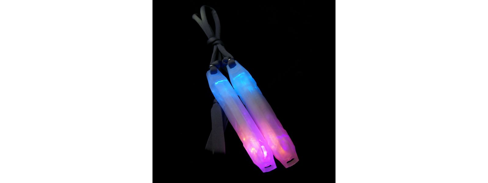 A pair of flowlights in crystal cases - diffused, protective covers that were designed for glowstickers, "stringers" and poi spinners who enjoy lightweight rigs. Comes with flowleash with swivelled flowloop handles.
